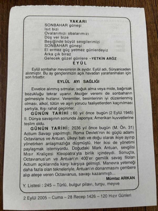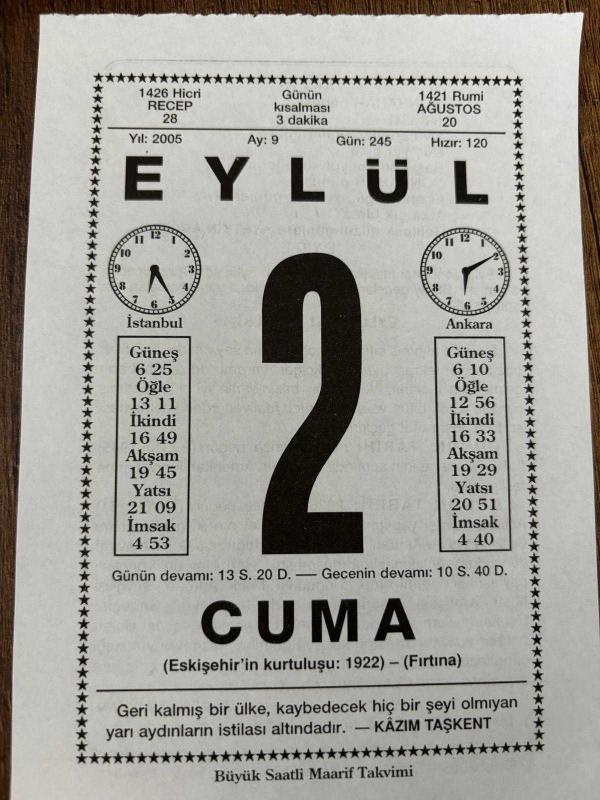 2 EYLÜL 2005 - TAKVİM YAPRAĞI - DOĞUM GÜNÜ HEDİYESİ - BÜYÜK SAATLİ MAARİF TAKVİMİ - KAZIM TAŞKENT - YETKİN ARÖZ - EYLÜL AYI SAĞLIĞI - II.DÜNYA SAVAŞI SONUNDA JAPONYA AMERİKA'YA TESLİM OLDU - MÜMTAZ ARIKAN, en son 8 ay önce güncellenmiştir.