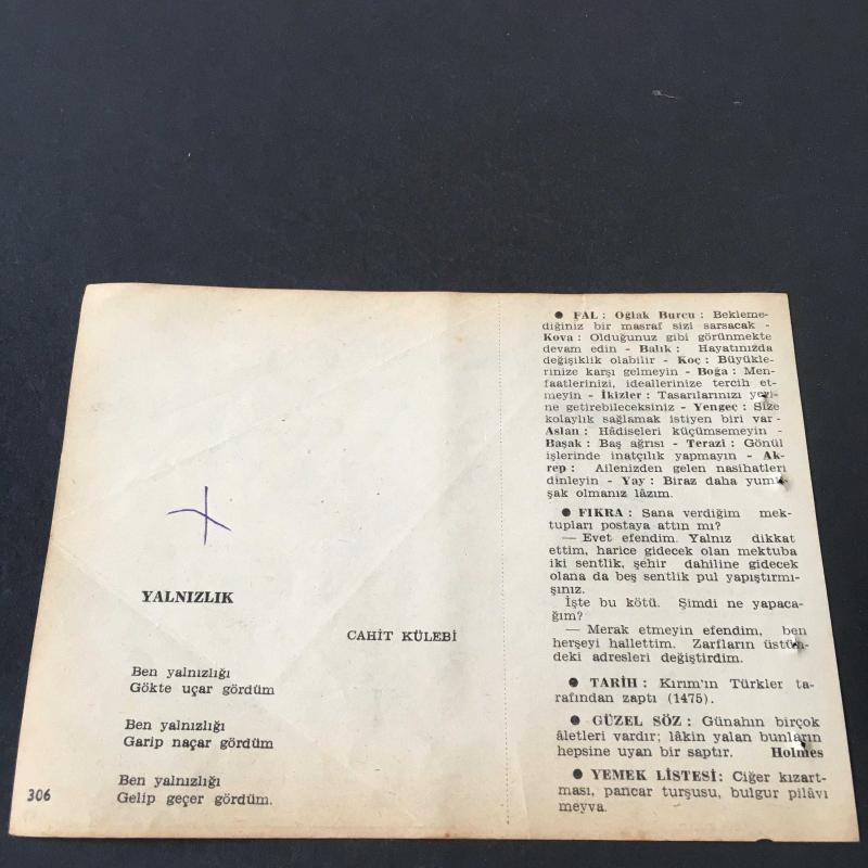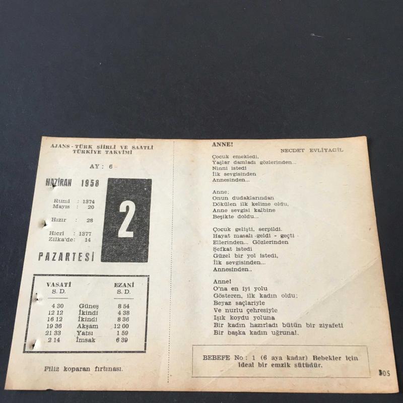 2 HAZİRAN 1958 -TAKVİM YAPRAĞI-DOĞUM GÜNÜ HEDİYESİ-AJANS-TÜRK ŞİİRLİ VE SAATLİ TÜRKİYE TAKVİMİ,NECDET EVLİYAGİL,CAHİT KÜLEBİ,FAL,FIKRA,KIRIMIN TÜRKLER TARAFINDAN ZAPTI,1475,GÜZEL SÖZ,YEMEK LİSTESİ başlıklı ürün, Efemera, Müzik, Sinema > Belge ve Evraklar > Takvimler kategorisi altında İkinci El olarak satılmaktadır.
