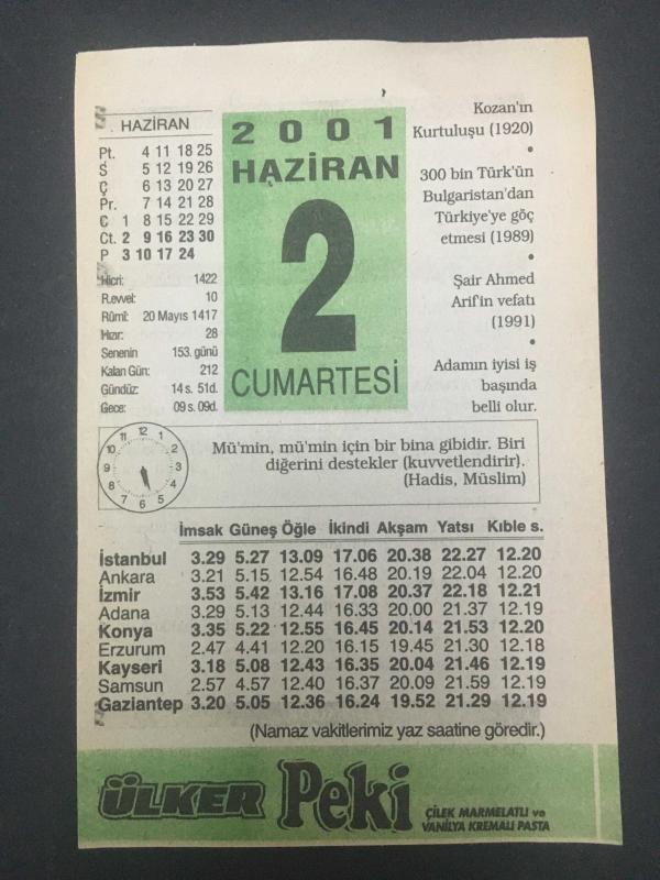 2 HAZİRAN 2001-TAKVİM YAPRAĞI-DOĞUM GÜNÜ HEDİYESİ-ÜLKER TAKVİMİ,KOZANIN KURTULUŞU 1920,300 BİN TÜRKÜN BULGARİSTANDAN YÜRKİYE GÖÇ ETMESİ 1989,ŞAİR AHMET ERİFİN VEFATI 1991,ADAMIN İYİSİ İŞ BAŞINDA BELLİ OLUR,DUA ET DE KOPMASIN, 1 yıl önce satışa sunulmuştur.