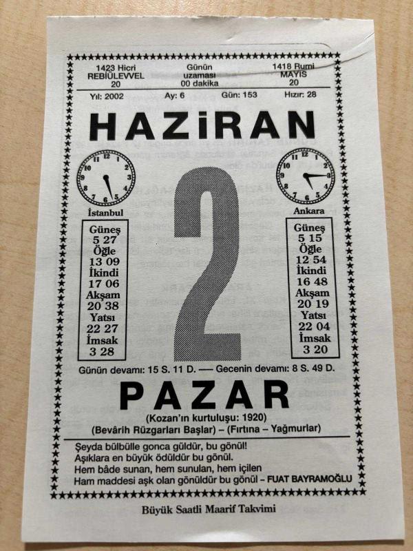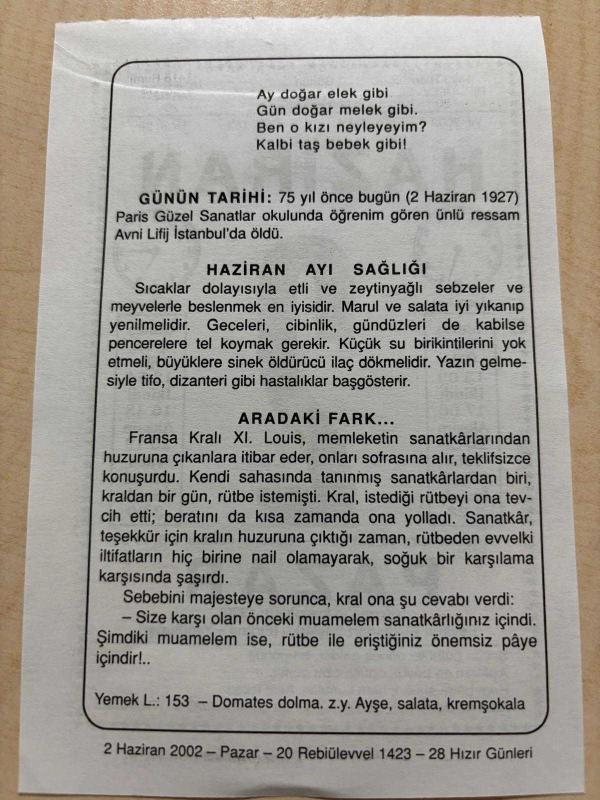 2 HAZİRAN 2002 - TAKVİM YAPRAĞI - DOĞUM GÜNÜ HEDİYESİ - BÜYÜK SAATLİ MAARİF TAKVİMİ - FUAT BAYRAMOĞLU - HAZİRAN AYI SAĞLIĞI - ÜNLÜ RESSAM AVNİ LİFİJ'İN VEFATI - ARADAKİ FARK ADLI YAZI, en son 8 ay önce güncellenmiştir.