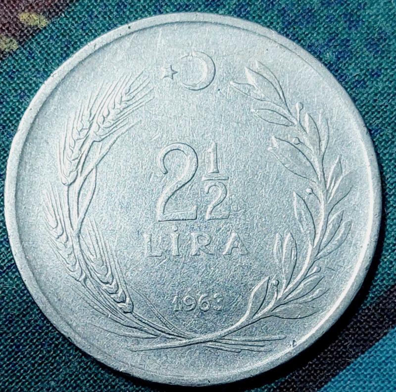 2½ LİRA, 1963 Paslanmaz Çelik Ağırlık 12 gram ÇÇT+ Bu paralarda kenar yazısı tura yüzüne göre TERS ve DÜZ olarak iki değişik şekilde okunabilir. BU PARADA TC KENAR YAZISI tura yüzünden baktığınızda "YAZI TARAFINA" BAKMAKTADIR. 1