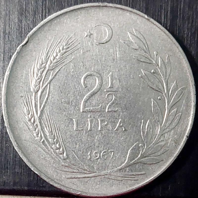 2½ LİRA, 1967 Paslanmaz Çelik Ağırlık 12 gram ÇÇT+ Bu paralarda kenar yazısı tura yüzüne göre TERS ve DÜZ olarak iki değişik şekilde okunabilir. BU PARADA TC KENAR YAZISI tura yüzünden baktığınızda "YAZI TARAFINA" BAKMAKTADIR. 1