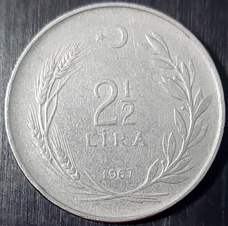 2½ LİRA, 1967 Paslanmaz Çelik Ağırlık 12 gram ÇÇT+ Bu paralarda kenar yazısı tura yüzüne göre TERS ve DÜZ olarak iki değişik şekilde okunabilir. BU PARADA TC KENAR YAZISI tura yüzünden baktığınızda "YAZI TARAFINA" BAKMAKTADIR. 3