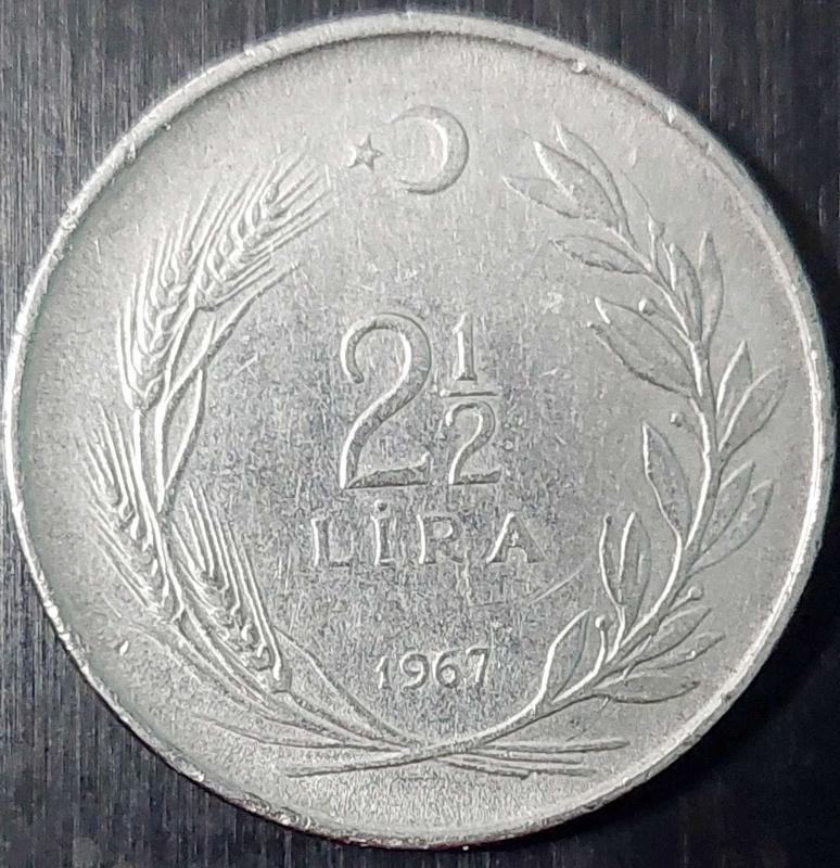2½ LİRA, 1967 Paslanmaz Çelik Ağırlık 12 gram ÇÇT+ Bu paralarda kenar yazısı tura yüzüne göre TERS ve DÜZ olarak iki değişik şekilde okunabilir. BU PARADA TC KENAR YAZISI tura yüzünden baktığınızda "YAZI TARAFINA" BAKMAKTADIR. 6