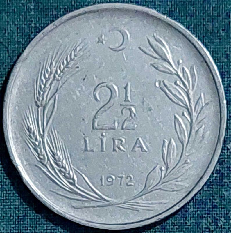 2½ LİRA 1972 Paslanmaz Çelik Ağırlık 12 gram ÇA Bu paralarda kenar yazısı tura yüzüne göre TERS ve DÜZ olarak iki değişik şekilde okunabilir. BU PARADA TC KENAR YAZISI tura yüzünden baktığınızda "YAZI TARAFINA" BAKMAKTADIR. 2