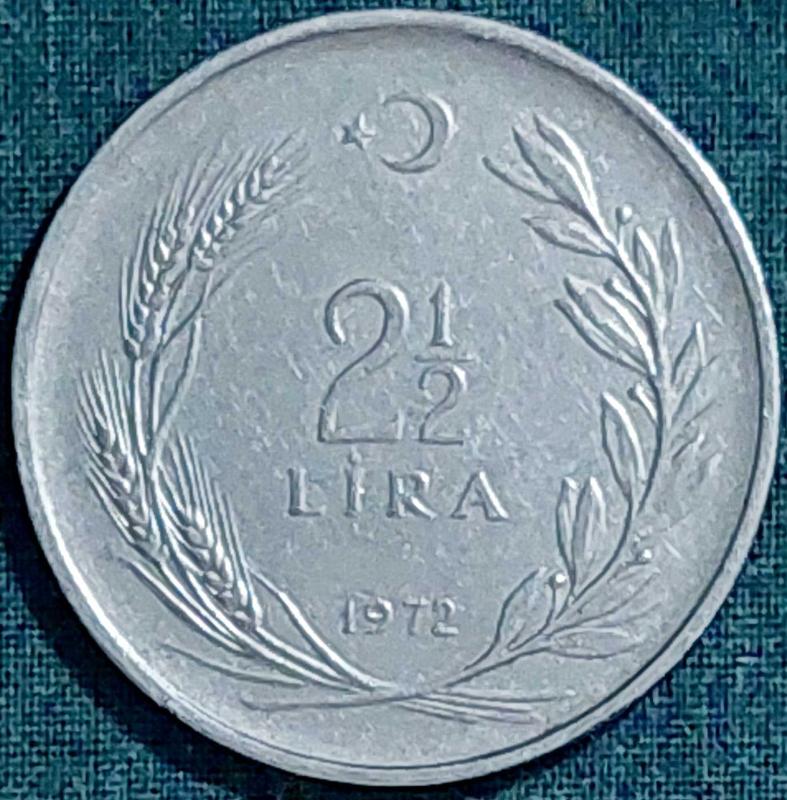 2½ LİRA 1972 Paslanmaz Çelik Ağırlık 12 gram ÇÇT+ Bu paralarda kenar yazısı tura yüzüne göre TERS ve DÜZ olarak iki değişik şekilde okunabilir. BU PARADA TÜRKİYE CUMHURİYETİ KENAR YAZISI tura yüzünden baktığınızda "TURA TARAFINA" BAKMAKTADIR. 3