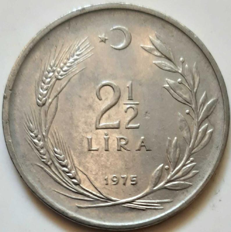 2½ LİRA 1975 Paslanmaz Çelik Ağırlık 9 gram ÇA Bu paralarda kenar yazısı tura yüzüne göre TERS ve DÜZ olarak iki değişik şekilde okunabilir. BU PARADA TÜRKİYE CUMHURİYETİ KENAR YAZISI tura yüzünden baktığınızda "TURA TARAFINA" BAKMAKTADIR. 2