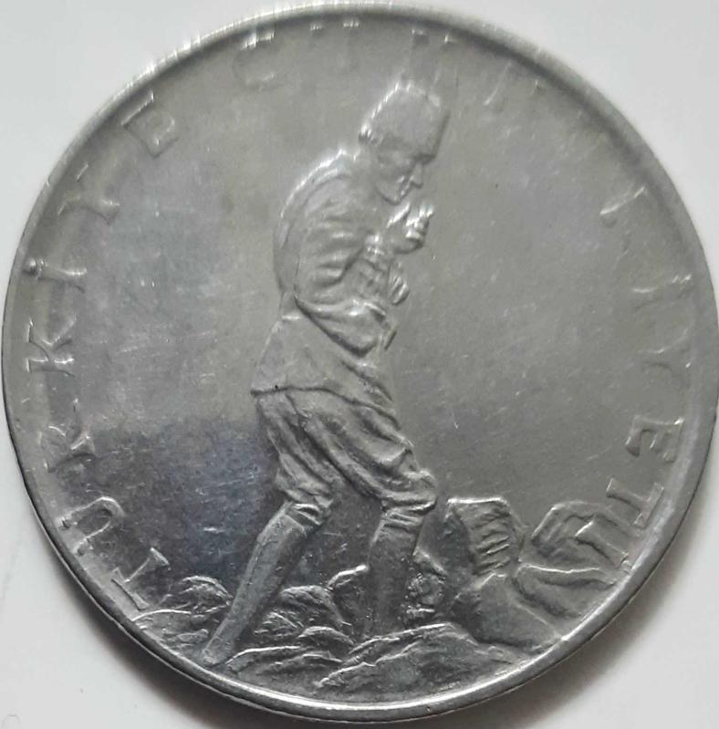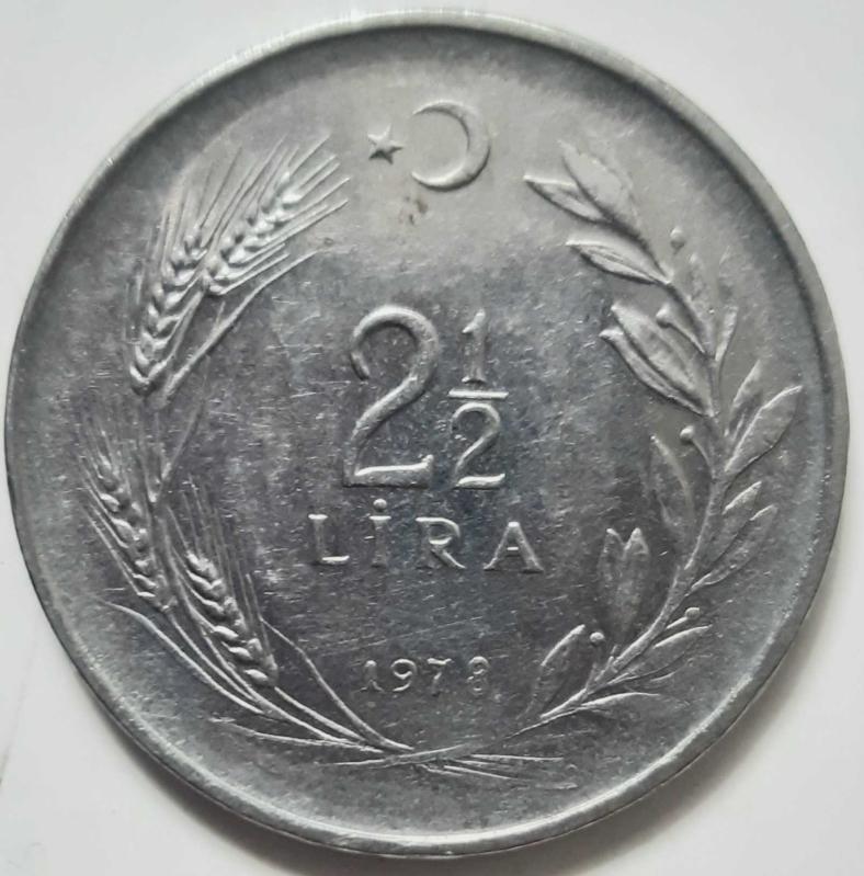 2½ LİRA 1978 Paslanmaz Çelik Ağırlık 9 gram ÇİL Bu paralarda kenar yazısı tura yüzüne göre TERS ve DÜZ olarak iki değişik şekilde okunabilir. BU PARADA TÜRKİYE CUMHURİYETİ KENAR YAZISI tura yüzünden baktığınızda "TURA TARAFINA" BAKMAKTADIR. 2
