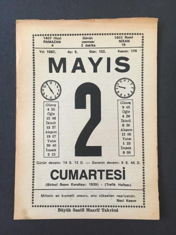 2 MAYIS 1987 -TAKVİM YAPRAĞI-DOĞUM GÜNÜ HEDİYESİ-BÜYÜK SAATLİ MAARİF TAKVİMİ,1.BASIN KURULTAYI 1939,TRAFİK HAFTASI,PEYGAMBERİMİZİN BÜYÜKLÜĞÜ,DÜNYA TRAFİK HAFTASI,1.TÜRK NEŞRİYAT KONGRASİ AÇILMIŞTI 2 MAYIS 1939,ÇOCUK EVDE YETİŞİR başlıklı ürün, Efemera, Müzik, Sinema > Belge ve Evraklar > Takvimler kategorisi altında İkinci El olarak satılmaktadır.