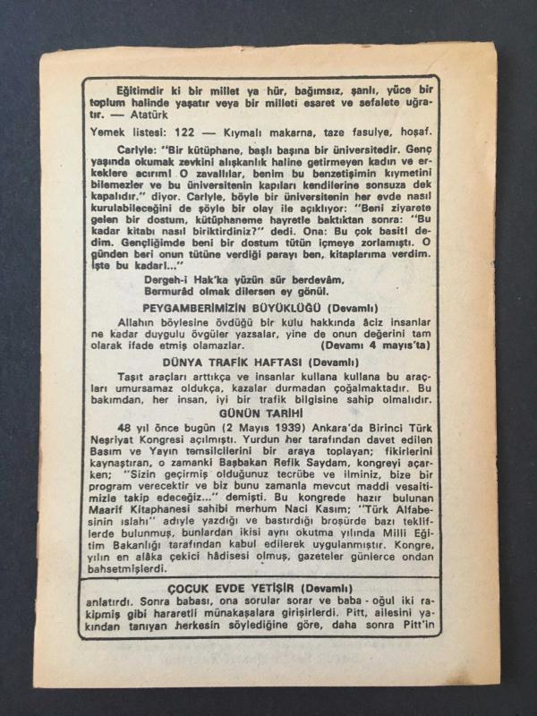 2 MAYIS 1987 -TAKVİM YAPRAĞI-DOĞUM GÜNÜ HEDİYESİ-BÜYÜK SAATLİ MAARİF TAKVİMİ,1.BASIN KURULTAYI 1939,TRAFİK HAFTASI,PEYGAMBERİMİZİN BÜYÜKLÜĞÜ,DÜNYA TRAFİK HAFTASI,1.TÜRK NEŞRİYAT KONGRASİ AÇILMIŞTI 2 MAYIS 1939,ÇOCUK EVDE YETİŞİR, 1 yıl önce satışa sunulmuştur.