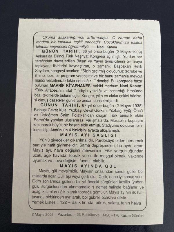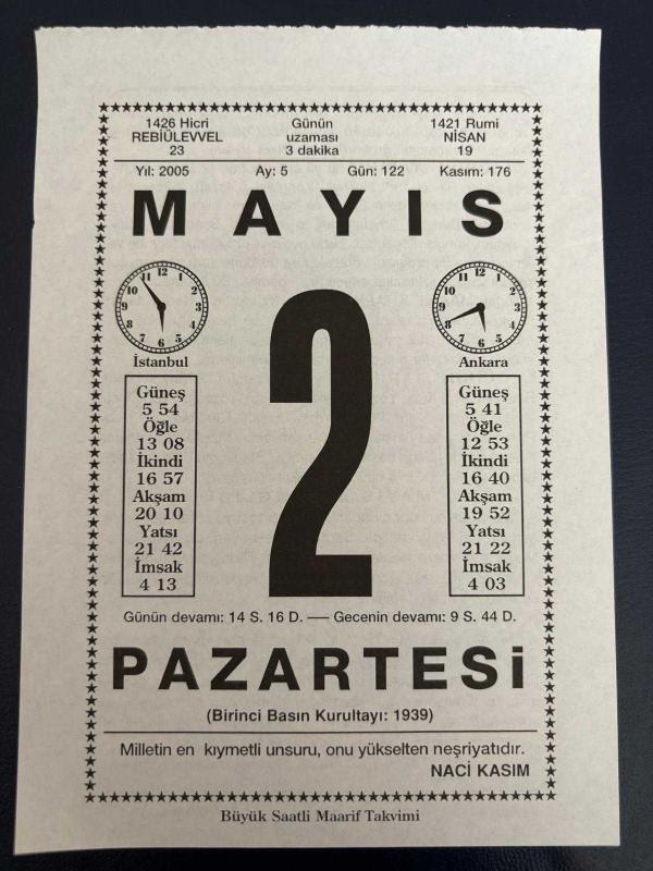 2 MAYIS 2005 - TAKVİM YAPRAĞI - DOĞUM GÜNÜ HEDİYESİ - BÜYÜK SAATLİ MAARİF TAKVİMİ - NACİ KASIM - TÜRK BİNİCİLİK EKİBİNİN ROMA DA KUPA KAZANMASI - MAYIS AYI SAĞLIĞI - MAYIS AYINDA GÜL, 6 ay önce satışa sunulmuştur.