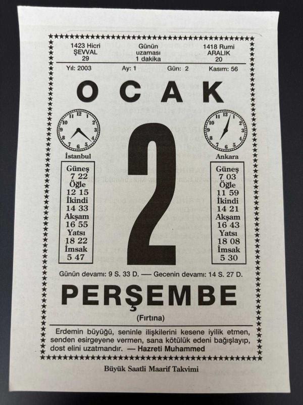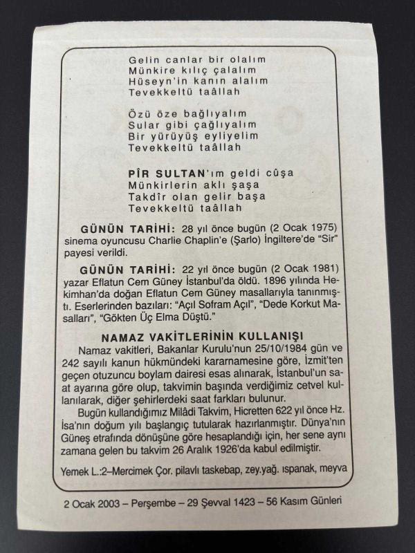 2 OCAK 2003 - TAKVİM YAPRAĞI - DOĞUM GÜNÜ HEDİYESİ - BÜYÜK SAATLİ MAARİF TAKVİMİ - HZ. MUHAMMED - PİR SULTAN ABDAL -NAMAZ VAKİTELERİNİN KULLANIŞI - YAZAR EFLATUN CEM GÜNAY'IN VEFATI - CHARLİE CHAPLİN'E SİR PAYESİ VERİLDİ, 7 ay önce satışa sunulmuştur.