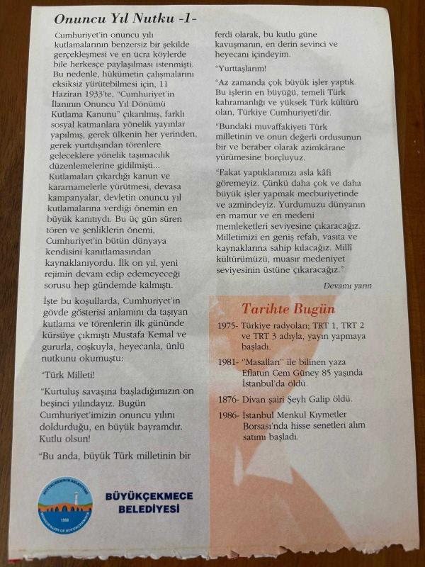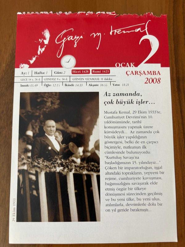 2 OCAK 2008 - TAKVİM YAPRAĞI - DOĞUM GÜNÜ HEDİYESİ - GAZİ MUSTAFA KEMAL ATATÜRK FOTOĞRAFLI BÜYÜKÇEKMECE BELEDİYESİ TAKVİMİ - Az zamanda, çok büyük işler - Onuncu Yıl Nutku -1- 1975- Türkiye radyoları; TRT 1, TRT 2 ve TRT 3 adıyla, yayın yapmaya başladı - 1981- "Masalları" ile bilinen yazar Eflatun Cem Güney 85 yaşında İstanbul'da öldü - 1876- Divan şairi Şeyh Galip öldü - 1986- İstanbul Menkul Kıymetler Borsası'nda hisse senetleri alım satımı başladı, 3 ay önce satışa sunulmuştur.