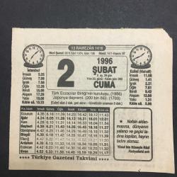 2 ŞUBAT 1996 -TAKVİM YAPRAĞI-DOĞUM GÜNÜ HEDİYESİ-TÜRKİYE GAZETESİ TAKVİMİ,TÜRK ECZACILAR BİRLİĞİNİN KURULUŞU 1956,JAPONYA DEPREMİ 1703,REENKARNASYON, en son 8 ay önce güncellenmiştir.
