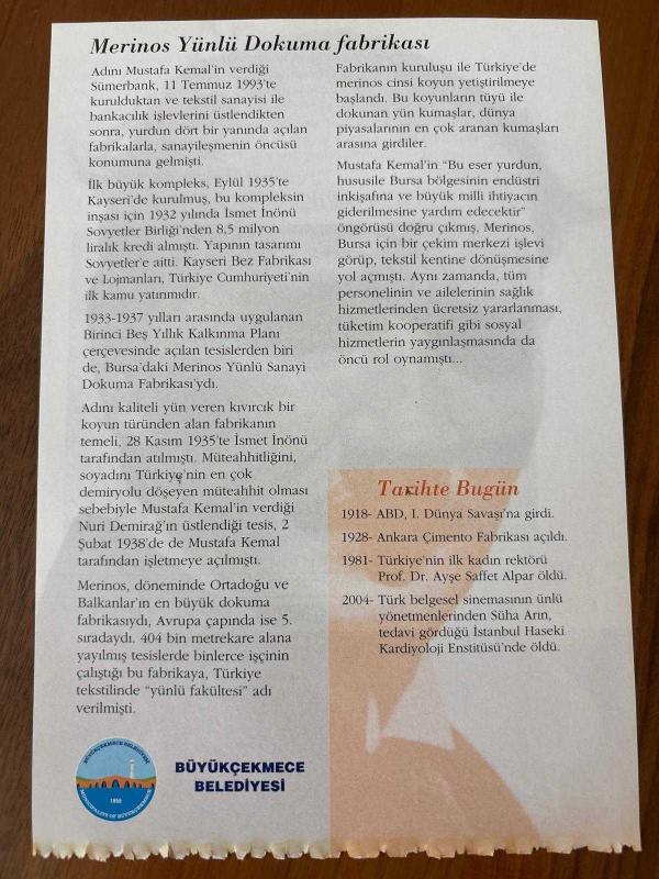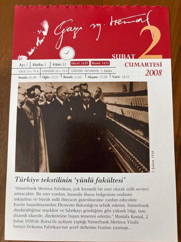 2 ŞUBAT 2008 - TAKVİM YAPRAĞI - DOĞUM GÜNÜ HEDİYESİ - GAZİ MUSTAFA KEMAL ATATÜRK FOTOĞRAFLI BÜYÜKÇEKMECE BELEDİYESİ TAKVİMİ - Türkiye tekstilinin 'yünlü fakültesi' - Merinos Yünlü Dokuma fabrikası - 1918- ABD, I. Dünya Savaşı'na girdi - 1928- Ankara Çimento Fabrikası açıldı - 1981- Türkiye'nin ilk kadın rektörü Prof. Dr. Ayşe Saffet Alpar öldü - 2004- Türk belgesel sinemasının ünlü yönetmenlerinden Süha Arın, tedavi gördüğü İstanbul Haseki Kardiyoloji Enstitüsü'nde öldü, en son 9 ay önce güncellenmiştir.