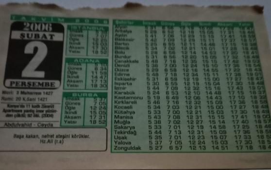 2 Şubat 2006-Orijinal Takvim Yaprağı-Doğum Günü-Söz,Nişan,Nikâh,Düğün ve Önemli Günler Hediyesi-Bizim Anadolu Takvimleri-Ayet-Hadis(Hz.Ali(r.a.))(Konya'da 11 katlı Zümrüt Apartmanı yanlış imar yüzünden çoktü;92 ölü.(2004))-Abdulvahid,Ceyda-Akçakoca, en son 3 ay önce güncellenmiştir.