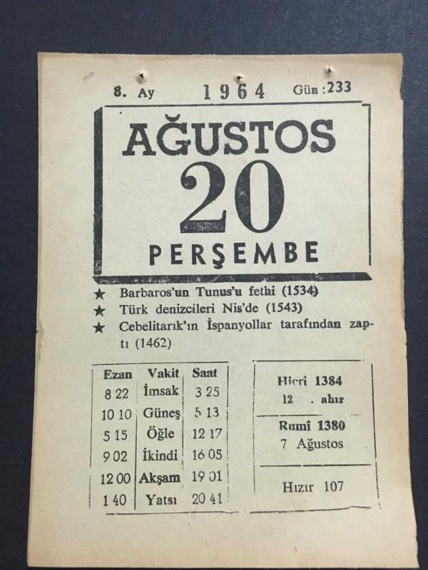 20 AĞUSTOS 1964-TAKVİM YAPRAĞI-DOĞUM GÜNÜ HEDİYESİ,BARBOROSUN TUNUSU FETHİ,1534,TÜRK DENİZCİLERİ NİS DE 1543,CEBELİTARIKIN İSPANYOLLAR TARAFINDAN ZAPTI 1462,PEYGAMBER SAYISI başlıklı ürün, Efemera, Müzik, Sinema > Belge ve Evraklar > Takvimler kategorisi altında İkinci El olarak satılmaktadır.