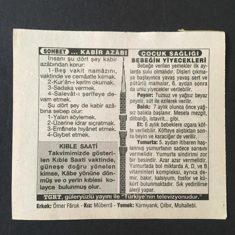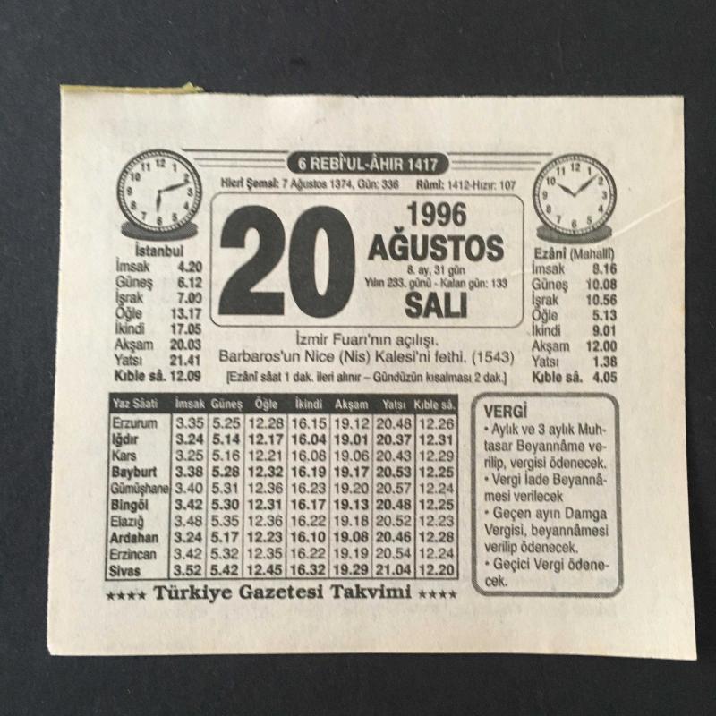 20 AĞUSTOS 1996 -TAKVİM YAPRAĞI-DOĞUM GÜNÜ HEDİYESİ-TÜRKİYE GAZETESİ TAKVİMİ,İZMİR FUARININ AÇILIŞI,BARBOROSUN NİCE NİS KALESİNİ FETHİ 1543,KABİR AZABI,BEBEĞİN YİYECEKLERİ, en son 8 ay önce güncellenmiştir.