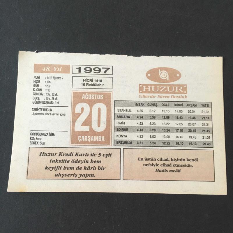 20 AĞUSTOS 1997 -TAKVİM YAPRAĞI-DOĞUM GÜNÜ HEDİYESİ-HUZUR TAKVİMİ,ULUSLARARASI İZMİR FUARININ AÇILIŞI,ÇOCUĞUNUZA İSİM,GENÇLİK NEYE MUHTAÇ,MESCİDDE VAKAR, en son 8 ay önce güncellenmiştir.
