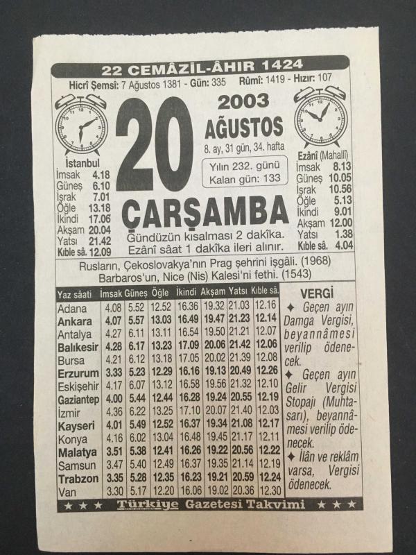 20 AĞUSTOS 2003-TAKVİM YAPRAĞI-DOĞUM GÜNÜ HEDİYESİ-TÜRKİYE GAZETESİ TAKVİMİ,RUSLARIN PRAG ŞEHRİNİ İŞGALİ,1968,BARBOROSUN NİCE KALESİNİ FETHİ 1543,KIYMALI BAMYA başlıklı ürün, Efemera, Müzik, Sinema > Belge ve Evraklar > Takvimler kategorisi altında İkinci El olarak satılmaktadır.