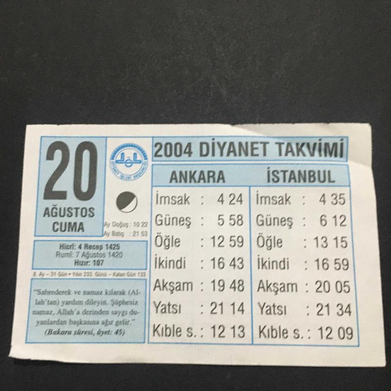 20 AĞUSTOS 2004-TAKVİM YAPRAĞI -DOĞUM GÜNÜ HEDİYESİ- DİYANET TAKVİMİ,DİNİN YENİDEN YÜKSELİŞİ başlıklı ürün, Efemera, Müzik, Sinema > Belge ve Evraklar > Takvimler kategorisi altında İkinci El olarak satılmaktadır.