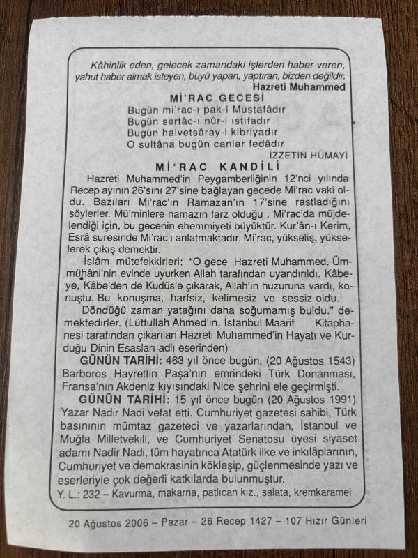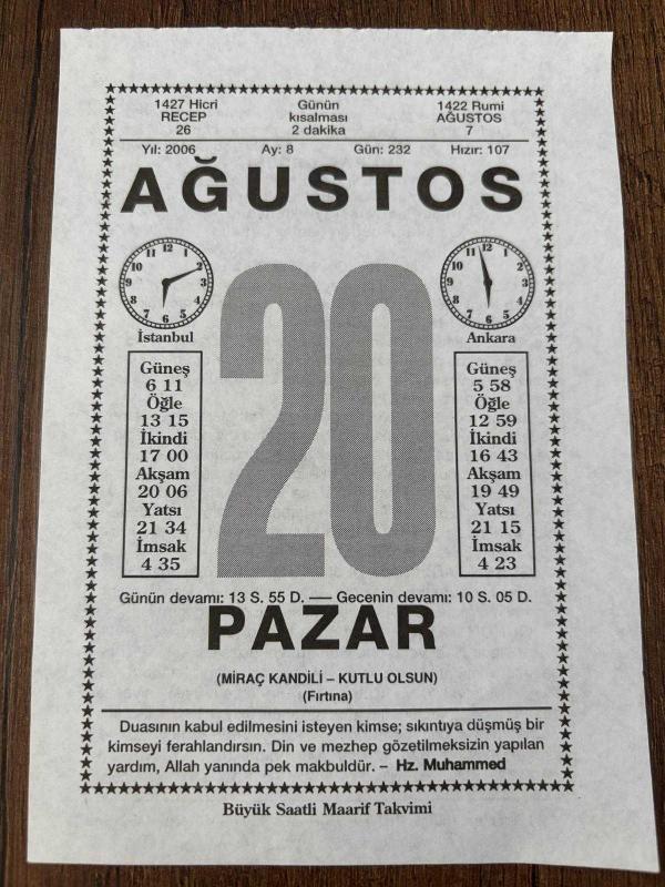 20 AĞUSTOS 2006 - TAKVİM YAPRAĞI - DOĞUM GÜNÜ HEDİYESİ - BÜYÜK SAATLİ MAARİF TAKVİMİ - HZ.MUHAMMED - İZZETTİN HÜMAYİ - Mİ'RAC KANDİLİ - TÜRK DONANMASI NİCE ŞEHRİNİ FETH ETTİ - YAZAR NADİR NADİ VEFAT ETTİ, en son 8 ay önce güncellenmiştir.