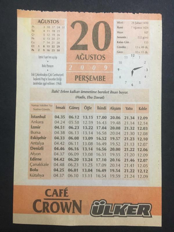 20 AĞUSTOS -2009-TAKVİM YAPRAĞI-DOĞUM GÜNÜ HEDİYESİ-ÜLKER TAKVİMİ,PRAG IN SOVYETLER BİRLİĞİ TARAFINDAN İŞGAL EDİLMESİ 1968,ÇOCUĞUNUZUN İSMİ,İMAM ŞAFİ,767-820,AYVALI KUZU TAS KEBABI başlıklı ürün, Efemera, Müzik, Sinema > Belge ve Evraklar > Takvimler kategorisi altında İkinci El olarak satılmaktadır.