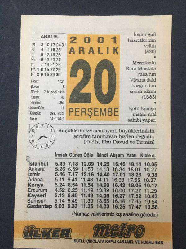 20 ARALIK 2001-TAKVİM YAPRAĞI-DOĞUM GÜNÜ HEDİYESİ-ÜLKER TAKVİMİ,İMAMI ŞAFİ HZ LERİNİN VEFATI 820,MERZİFONLU KARA MUSTAFA PAŞANIN VİYANADAKİ BOZGUNDAN SONRA İDAMI 1683,EKOLOJİ NEYLE UĞRAŞIR, en son 8 ay önce güncellenmiştir.