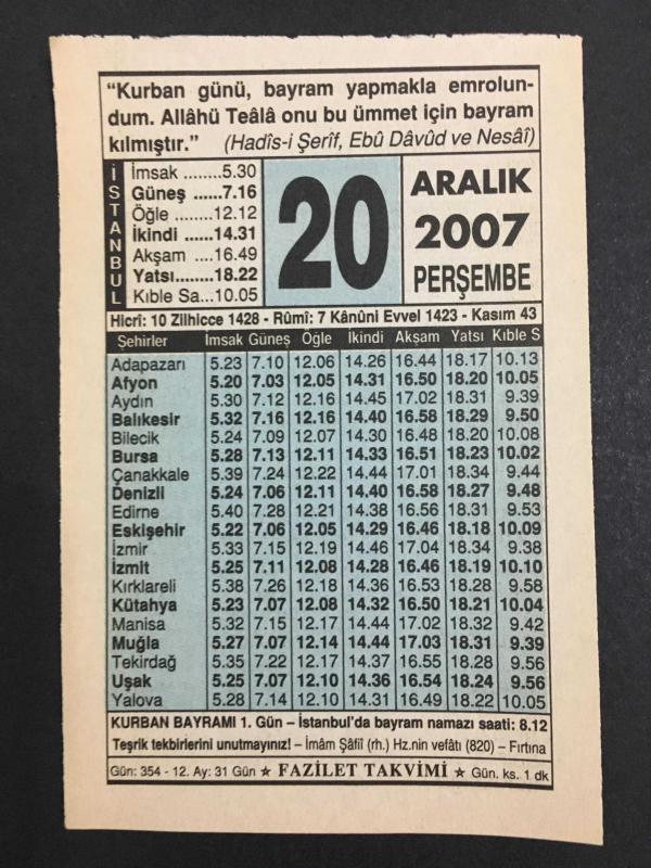 20 ARALIK 2007 -TAKVİM YAPRAĞI-DOĞUM GÜNÜ HEDİYESİ-FAZİLET TAKVİMİ,KURBAN BAYRAMI 1.GÜN,İMAM I ŞAFİ HZ NİN 820 VEFATI ,FIRTINAKURBAN BAYRAMI GÜNÜ MÜSTEHAB OLANLAR,KURBAN KESTİKTEN SONRA NE YAPMALI, en son 8 ay önce güncellenmiştir.