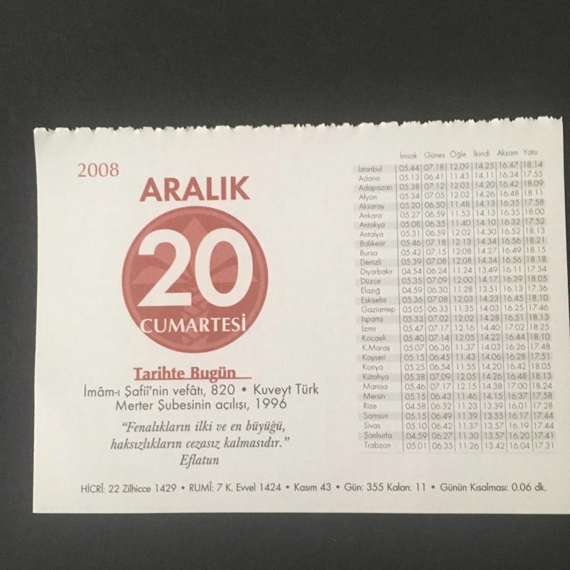 20 ARALIK 2008 -TAKVİM YAPRAĞI-DOĞUM GÜNÜ HEDİYESİ-KUVEYT TÜRK TAKVİMİ,İMAMI ŞAFİİ NİN VEFATI 820,BEŞ GAYB İLİM,KISSADAN HİSSE, 1 yıl önce satışa sunulmuştur.