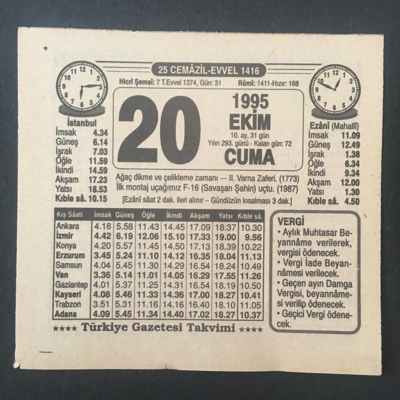 20 EKİM 1995 -TAKVİM YAPRAĞI-DOĞUM GÜNÜ HEDİYESİ-TÜRKİYE GAZETESİ TAKVİMİ,AĞAÇ DİKME VE ÇELİKLEME ZAMANI,2.VARNA ZAFERİ,1773,İLK MOTAJ UÇAĞIMIZ F-16 UÇTU 1987,ABDURRAHMAN BİN AVF, en son 8 ay önce güncellenmiştir.