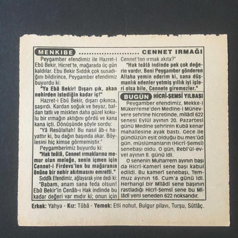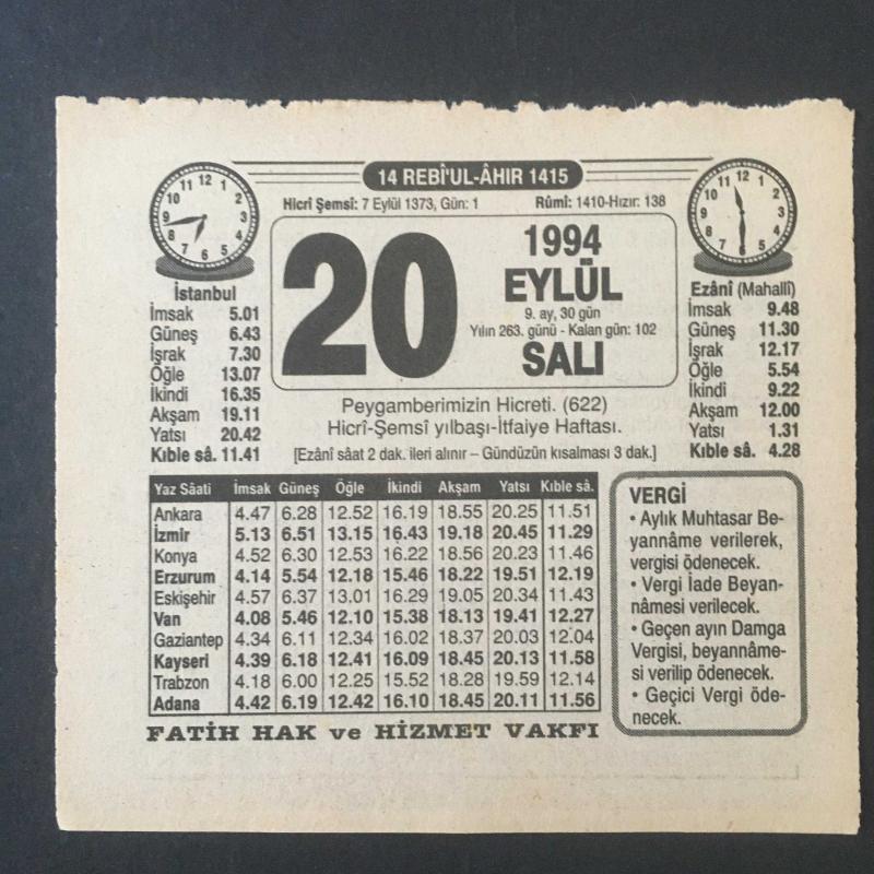 20 EYLÜL 1994 -TAKVİM YAPRAĞI-DOĞUM GÜNÜ HEDİYESİ-FATİH HAK VE HİZMET VAKFI TAKVİMİ,PEYGAMBERİMİZİN HİCRETİ 622,HİCRİ ŞEMSİ YILBAŞI -İTFAİYE HAFTASI,CENNET IRMAĞI başlıklı ürün, Efemera, Müzik, Sinema > Belge ve Evraklar > Takvimler kategorisi altında İkinci El olarak satılmaktadır.