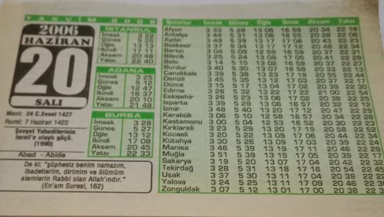 20 Haziran 2006-Orijinal Takvim Yaprağı-Doğum Günü-Söz,Nişan,Nikâh,Düğün ve Önemli Günler Hediyesi-Bizim Anadolu Takvimleri-Ayet-Hadis(En'am Suresi,162))(Sovyet Yahudilerinin İsrail'e olaylı göçü(1990))-Abad,Abide-Doğada Yaşam, en son 2 ay önce güncellenmiştir.