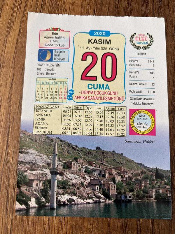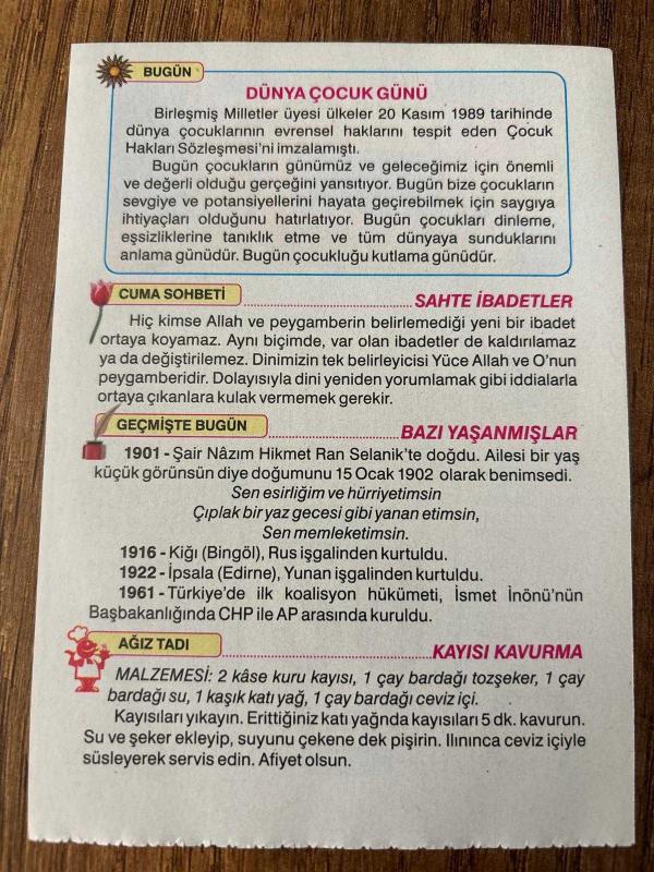 20 KASIM 2020 - TAKVİM YAPRAĞI - DOĞUM GÜNÜ HEDİYESİ - BÜYÜK SAATLİ MAARİF TAKVİMİ -Şanlıurfa, Halfeti -DÜNYA ÇOCUK GÜNÜ -1901 - Şair Nâzım Hikmet Ran Selanik'te doğdu- 1916 - Kiğı (Bingöl), Rus işgalinden kurtuldu. 1922 - İpsala (Edirne), Yunan işgalinden kurtuldu. 1961 - Türkiye'de ilk koalisyon hükümeti, İsmet İnönü'nün Başbakanlığında CHP ile AP arasında kuruldu - KAYISI KAVURMA, en son 8 ay önce güncellenmiştir.