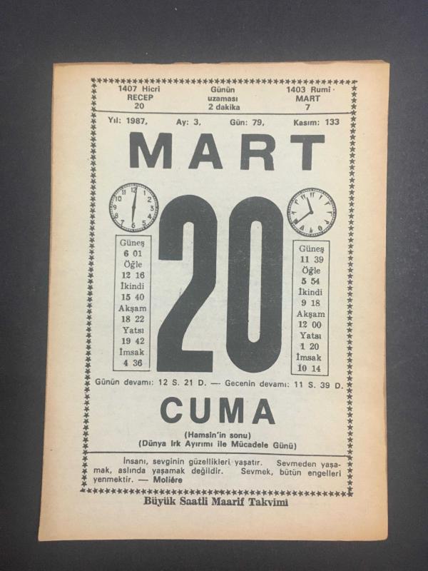20 MART 1987 -TAKVİM YAPRAĞI-DOĞUM GÜNÜ HEDİYESİ-BÜYÜK SAATLİ MAARİF TAKVİMİ,HAMSİNİN SONU,DÜNYA IRK AYIRIMI İLE MÜCADELE GÜNÜ,BAHAR VE BÜLBÜL,KIŞ FASLININ SONU,BAHAR FASLI,YRNİ YILIN TALİHİ ZAYİÇE,EVLENMEDE MUTLULUK, en son 8 ay önce güncellenmiştir.