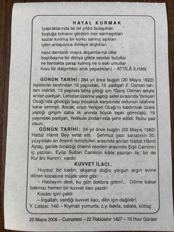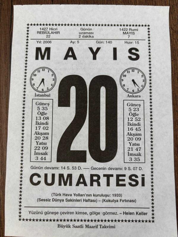 20 MAYIS 2006 - TAKVİM YAPRAĞI - DOĞUM GÜNÜ HEDİYESİ - BÜYÜK SAATLİ MAARİF TAKVİMİ - HELEN KELLER - ATİLLA İLHAN - PADİŞAH 2.OSMANIN TAHTAN İNDİRİLMESİ - HATTAT HAMİT BEY'İN VEFATI, en son 8 ay önce güncellenmiştir.