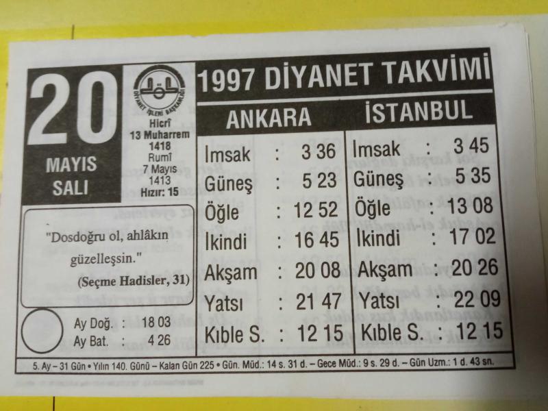 20 Mayıs 1997 takvim yaprağı (Diyanet Takvimi), en son 1 yıl önce güncellenmiştir.