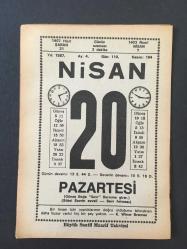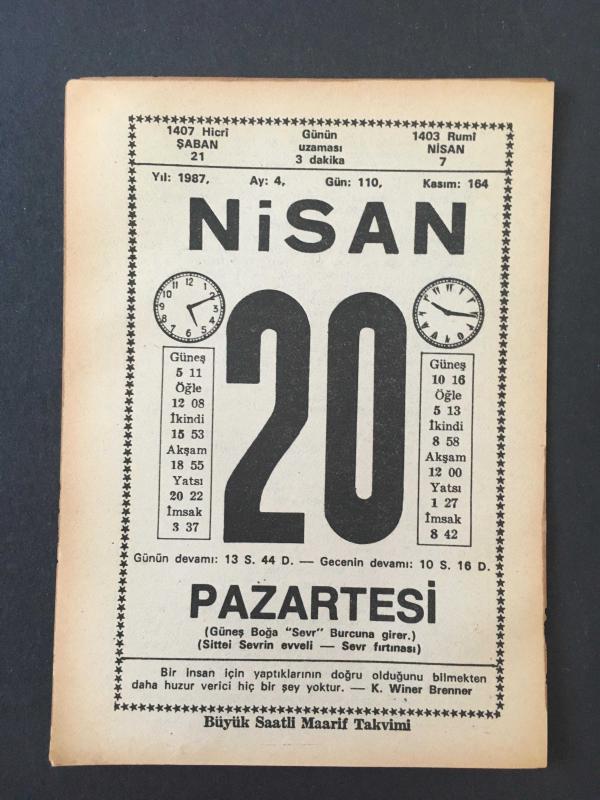 20 NİSAN 1987 -TAKVİM YAPRAĞI-DOĞUM GÜNÜ HEDİYESİ-BÜYÜK SAATLİ MAARİF TAKVİMİ,GÜNEŞ BOĞA BURCUNA GİRDİ,SİTTEİ SEVR İN EVVELİ ,SEVR FIRTINASI,İSTİKBAL,YUMURTA,SİTTE İ SEVR İN BAŞLANGICI,VOLTAİRE DEN