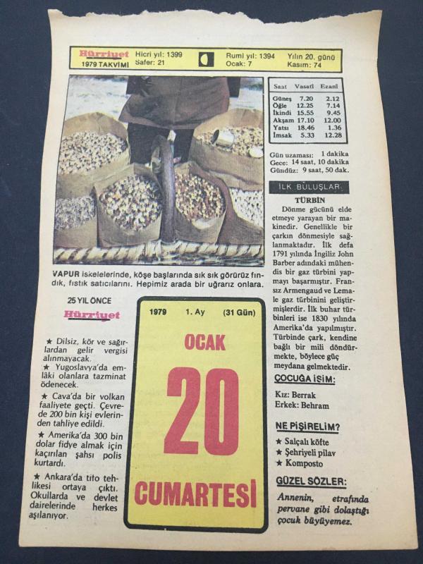 20 OCAK 1979 -TAKVİM YAPRAĞI-DOĞUM GÜNÜ HEDİYESİ-HÜRRİYET TAKVİMİ,ÇOCUĞA İSİM,SPOR DÜNYASI SABRİ DİNO,İLK ANAYASAMIZIN KABULÜ,1921,MİDİLLİ KRUVÖZÖRÜNÜN BATIŞI 1918,DARUACEZENİN KURTULUŞU 1895, en son 8 ay önce güncellenmiştir.