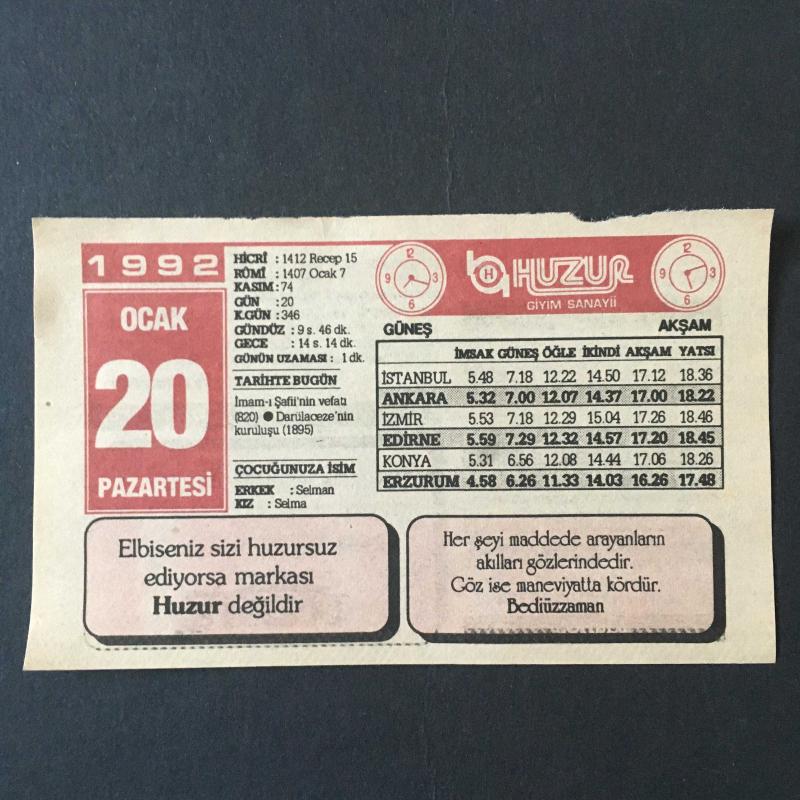 20 OCAK 1992 -TAKVİM YAPRAĞI-DOĞUM GÜNÜ HEDİYESİ-HUZUR TAKVİMİ,İMAM I ŞAFİİ NİN VEFATI 820,DARULACEZENİN KURULUŞU 1895,İMAM I ŞAFİİ,YAKINLARI GÖZETMEK,GÜNÜN YEMEĞİ,