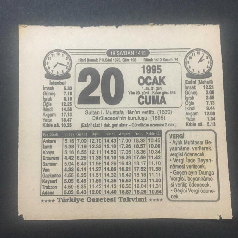 20 OCAK 1995-TAKVİM YAPRAĞI-DOĞUM GÜNÜ HEDİYESİ-TÜRKİYE GAZETESİ TAKVİMİ,1.MUSTAFANIN VEFATI 1639,DARULACEZENİN KURULUŞU 1895,İMANSIZ GİTMEK,PERDE BAKIMI, başlıklı ürün, Efemera, Müzik, Sinema > Belge ve Evraklar > Takvimler kategorisi altında İkinci El olarak satılmaktadır.