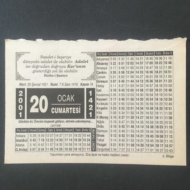 20 OCAK 2001 -TAKVİM YAPRAĞI-DOĞUM GÜNÜ HEDİYESİ-HİZMET TAKVİMİ,KILIÇLARIMIZLA SENİ DOĞRULTURUZ,GÜNÜMÜZ İDARECELERİN DİKKATİNE başlıklı ürün, Efemera, Müzik, Sinema > Belge ve Evraklar > Takvimler kategorisi altında İkinci El olarak satılmaktadır.