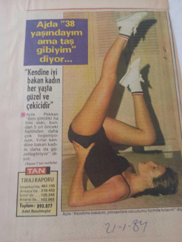 20 Ocak 1984 - Ajda Pekkan: ''38 yaşındayım ama taş gibiyim'' diyor - ''Kendine iyi bakan kadın her yaşta güzel ve çekicidir'' - Ajda ''Kendime bakarım, jimnastikle vücudumu formda tutarım'' diyor - Gazete haberi - Tek Yaprak Arkalı Önlüdür adlı eser, Kitap > Süreli Yayınlar > Dergiler > Spor kategorisinde İkinci El olarak satıştadır.