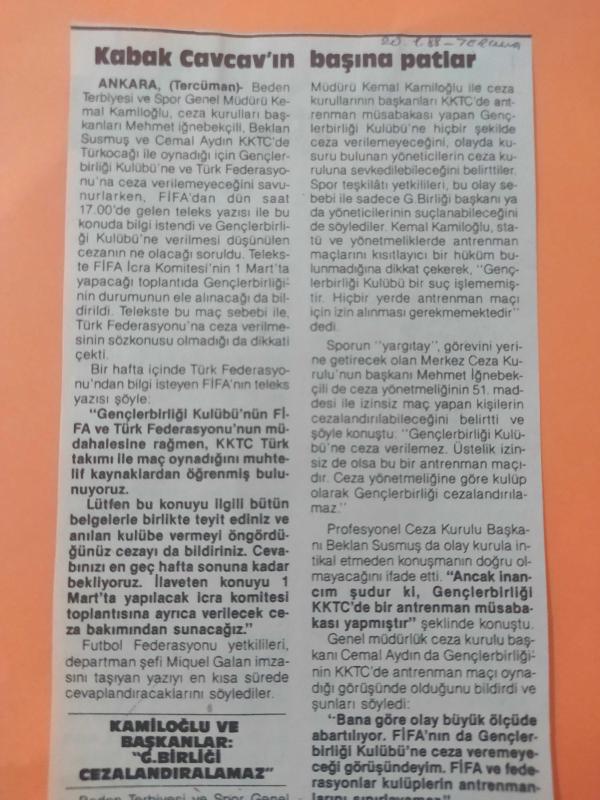 Kitap 1988 yılında yayınlanmıştır. 20 Ocak 1988 - Tercüman Gazetesi - Spor Teşkilatı'nın üst kademesinden ilgi çekici bir yorum çıktı - Kabak Cavcav'ın başına patlar - FİFA dün saat 17.00'de gönderdiği teleks yazısı ile federasyonumuzdan bilgi istedi - Gazete tam değil kupürüdür - 36x14cm ebatındadır.. adlı eser Türkçe dilindedir.