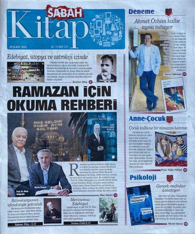 20 Şubat 2026 SABAH GAZETESİ KİTAP EKİ Doğum Günü Gazetesi (20.02.2026) Doğumgünü Hediyesi | Sıradışı Hediye | Özel Gün Hediyeleri | GAZETE ARŞİVİ | Muhammed İkbal EDEBİYAT ÜTOPYA ve ASTROLOJİ İZİNDE | Ramazan İçin Okuma Rehberi | Yağmur Dinç BİLİMKURGUNUN EFENDİSİYLE YOLCULUK | Serkan Ünlü MEVZUMUZ EDEBİYAT | Ahmet Özhan Kalbe Ayna Tutuyor | İbrahim Altay SENİ SORDUM YILDIZLARA | Tasavvufu Yetkin Akıl Üzerinden Düşünmek | HAYATI GÖRÜNÜR KILAN ROMANLAR | Gerçek Suçlulara Yakın Bakış | HIZ ÇAĞINDA GÖRMEK ve FARK ETMEK | Tanpınar'a Huzur Yok | Sabah Kitap, en son 29 gün önce güncellenmiştir.