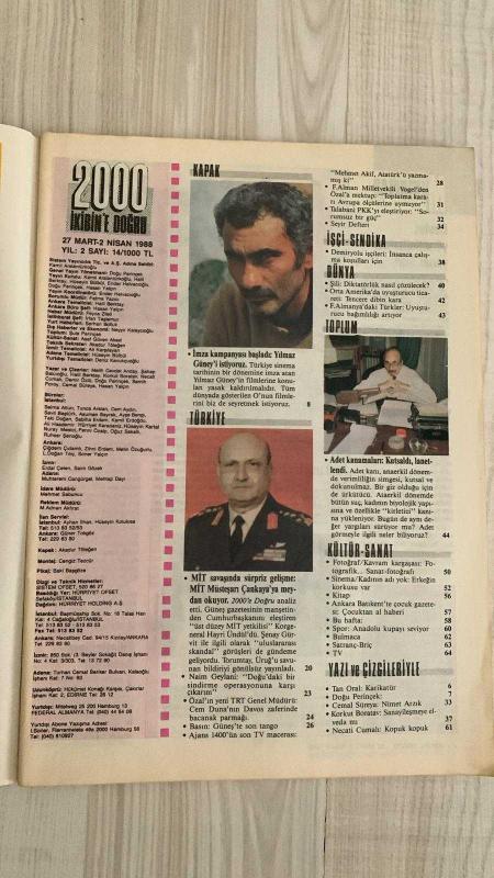 2000 İKİBİN’E DOĞRU AKTÜALİTE DERGİSİ – SAYI 14 – 27 MART–2 NİSAN 1988 – 64 SAYFA ULUSLARARASI SKANDAL: CUMHURBAŞKANINA EŞLİK VE MİT GÖREVİ – MİT SİYASİ GÖREVDE: KİMLER, NASIL, NEDEN? – İMZA KAMPANYASI BAŞLADI: YILMAZ GÜNEY’İ İSTİYORUZ – MİT ARŞİVİNDE YILMAZ GÜNEY – MİT’İN UYARISINA RAĞMEN GÖREVDE – ADALET KAVRAMLARI: KİTAPLIK, İNANÇ VE SİYASET – KADINLARIN GÜNLÜK YAŞAMI – KÜLTÜR-SANAT – SEMİH POROY – CEMAL SÜREYA – KAPAK – TÜRKİYE – İŞÇİ-SENDİKA – TOPLUM – KÜLTÜR-SANAT – YAZI VE ÇİZGİLERLE YILMAZ GÜNEY – DOĞU PERİNÇEK – NECATİ CUMALI – SEMİH POROY – CEMAL SÜREYA – MELİH CEVDET ANDAY – ŞAHAP BALCIOĞLU – NİHAT BEHRAM – HALİL BERKTAY – HÜSEYİN BÜLBÜL – SERHAN BOLLUK – NEYYİR KALAYCIOĞLU – SÜLEY PERİNÇEK – ASAF GÜVEN AKSEL – ROZERİN DOĞAN – ALİ KARŞILAYAN – DENİZ KAVUKÇUOĞLU – TUNCA ARSLAN – GÜLDEN AYDIN – SEVİL BASTÜRK – ASUMAN BAYRAK – AYŞE BENGİ – TÜRKAN DEMİR – TAKİ DOĞAN – SABİHA ERDEM – KAMİL ERDOĞDU – ALİ HASDEMİR – HÜRRİYET KARADENİZ – HÜSEYİN KALKAN – NURAY MESTCİ – FENNİ ÖZALP, Mehmet Sabuncu tarafından kaleme alınmıştır. Eser Doğu Perinçek editörlüğünde hazırlanmıştır. Kitap Sistem Yayıncılık tarafından yayınlanmıştır. 64 sayfadır. 2000 İKİBİN’E DOĞRU AKTÜALİTE DERGİSİ – SAYI 14 – 27 MART–2 NİSAN 1988 – 64 SAYFA ULUSLARARASI SKANDAL: CUMHURBAŞKANINA EŞLİK VE MİT GÖREVİ – MİT SİYASİ GÖREVDE: KİMLER, NASIL, NEDEN? – İMZA KAMPANYASI BAŞLADI: YILMAZ GÜNEY’İ İSTİYORUZ – MİT ARŞİVİNDE YILMAZ GÜNEY – MİT’İN UYARISINA RAĞMEN GÖREVDE – ADALET KAVRAMLARI: KİTAPLIK, İNANÇ VE SİYASET – KADINLARIN GÜNLÜK YAŞAMI – KÜLTÜR-SANAT – SEMİH POROY – CEMAL SÜREYA – KAPAK – TÜRKİYE – İŞÇİ-SENDİKA – TOPLUM – KÜLTÜR-SANAT – YAZI VE ÇİZGİLERLE YILMAZ GÜNEY – DOĞU PERİNÇEK – NECATİ CUMALI – SEMİH POROY – CEMAL SÜREYA – MELİH CEVDET ANDAY – ŞAHAP BALCIOĞLU – NİHAT BEHRAM – HALİL BERKTAY – HÜSEYİN BÜLBÜL – SERHAN BOLLUK – NEYYİR KALAYCIOĞLU – SÜLEY PERİNÇEK – ASAF GÜVEN AKSEL – ROZERİN DOĞAN – ALİ KARŞILAYAN – DENİZ KAVUKÇUOĞLU – TUNCA ARSLAN – GÜLDEN AYDIN – SEVİL BASTÜRK – ASUMAN BAYRAK – AYŞE BENGİ – TÜRKAN DEMİR – TAKİ DOĞAN – SABİHA ERDEM – KAMİL ERDOĞDU – ALİ HASDEMİR – HÜRRİYET KARADENİZ – HÜSEYİN KALKAN – NURAY MESTCİ – FENNİ ÖZALP adlı eser Türkçe dilindedir.