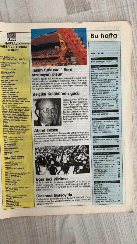 2000 İKİBİN’E DOĞRU AKTÜALİTE DERGİSİ – SAYI 24 – 14–20 HAZİRAN 1987 – 64 SAYFA ORDUDA TAYİNLER – “BELÇİKA KULÜBÜ”NÜN GÜCÜ – TAKIM TUTKUSU: “SENİ SEVMEYEN ÖLSÜN” – AHİRET CEZASI – EĞER İŞÇİ YÜRÜRSE – GLASNOST BOLŞOY’DA – “ERKEK SPORU”NA KADIN ELİ DEĞDİ – YÖK’ÜN ADALETSİZLİĞİ – TEK TİP ELBİSE GİYMEYECEĞİZ – “GEVECİLİK”TEN ÇOCUKLARIMI ÇEKİYORUM – ERZURUM CEZAEVİ İÇİN SORUŞTURMA TALEBİ – “İMAMOĞLU’NU SANDIKTAN ÇIKARIN” – “SENİ SEVMEYEN ÖLSÜN” BAKIN NEYE DÖNÜŞTÜ – “KADINLARIN VARLIK NEDENİ” – “AŞKLA BAŞLAYAN HER ŞEY” – “YENİ DEMOKRASİ” ÇIKTI – “GÖRÜNÜM” GELECEĞE ELEŞTİREL BAKIŞ DOĞU PERİNÇEK – SONER YALÇIN – SEMİH POROY – CEMAL SÜREYA – NECATİ CUMALI – MELİH CEVDET ANDAY – ŞAHAP BALCIOĞLU – NİHAT BEHRAM – HALİL BERKTAY – HÜSEYİN BÜLBÜL – SERHAN BOLLUK – NEYYİR KALAYCIOĞLU – SÜLEY PERİNÇEK – ASAF GÜVEN AKSEL – ROZERİN DOĞAN – ALİ KARŞILAYAN – DENİZ KAVUKÇUOĞLU – TUNCA ARSLAN – GÜLDEN AYDIN – SEVİL BASTÜRK – ASUMAN BAYRAK – AYŞE BENGİ – TÜRKAN DEMİR – TAKİ DOĞAN – SABİHA ERDEM – KAMİL ERDOĞ adlı eser, Kitap > Süreli Yayınlar > Dergiler > Siyaset kategorisinde İkinci El olarak satıştadır.