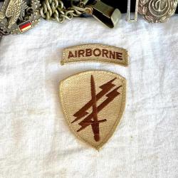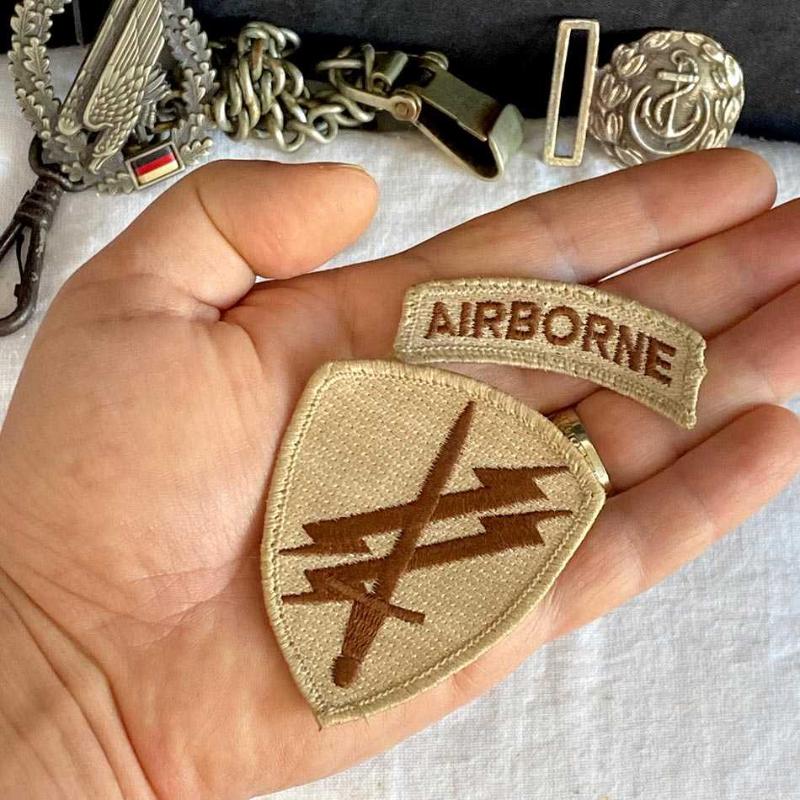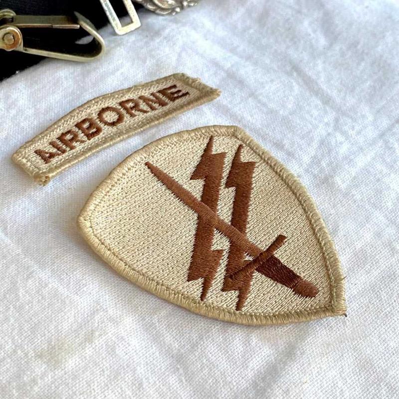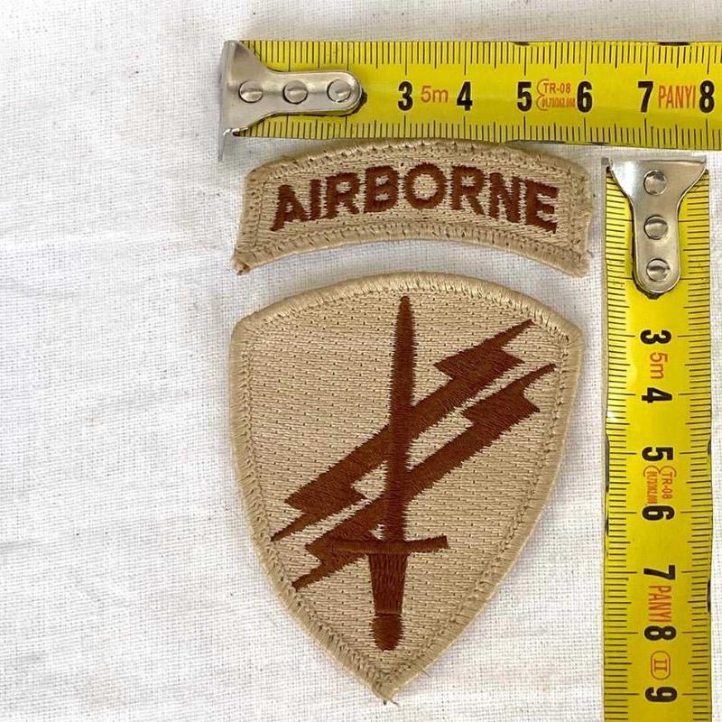 2 parçadan oluşan orijinal arma, ABD ordusu Hava İndirme Psikolojik Harekat biriminin bez arması. Armayı, 2002'de Afganistan'da birlikte görev yaptığımız, kendilerine çok şey öğrettiğimiz (bunun için bize takdir belgesi bile vermişlerdi) bir Amerikan askerinden klasik "arma değiş tokuşu" geleneği kapsamında almıştım. Armanın büyük parçasında ön yüzünde, birliğin çöl operasyonlarına uygun "Desert Tan" nakış işlemesiyle kılıç ve şimşek amblemi var. Arkasında ismini hatırlamadığım askerin el yazısıyla adı ve US ARMY yazıyor. Armanın küçük parçasında "AIRBORNE" nakışı işlenmiş. Arma yaşına göre çok iyi durumda, herhangi bir yırtık vs yoktur. 6x9 cm 20 gr