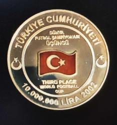2002 Türkiye Cumhuriyeti Dünya Futbol Şampiyonası Üçüncülüğü Anısına basılan hatıra parası. Çap 3,7 cm 31.47 GR GÜMÜŞTÜR 16365 ADET BASILMIŞTIR