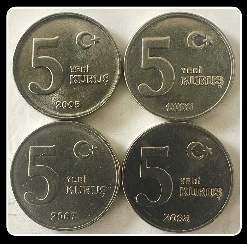 2005-2006-2007-2008 Tarihli 5 YENİ KURUŞ TAM TK. (5 YKrş.) KM#1165 (TCML5/8) Sadece bir kusa bir dönem için basılan YENİ KURUŞLAR serisi içinde 2008 tarihli olan en Az Bulunan (AB/S) paradır. Çil olanları bulmak zordur.